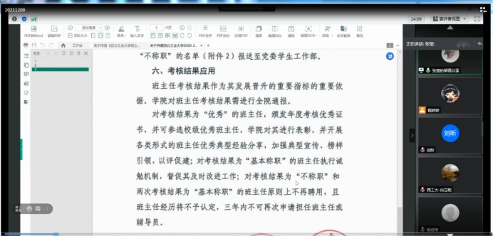 首先党委副书记张莹老师对学校和学院的班主任选聘、考评与管理办法进行了仔细解读,针对前几周班主任的考评意见进行了具体反馈。同时对学院年终考核绩效的具体办法进行了细致解读,各班主任也针对自身的实际情况进行了说明与建议,张莹老师也均一一进行解答。