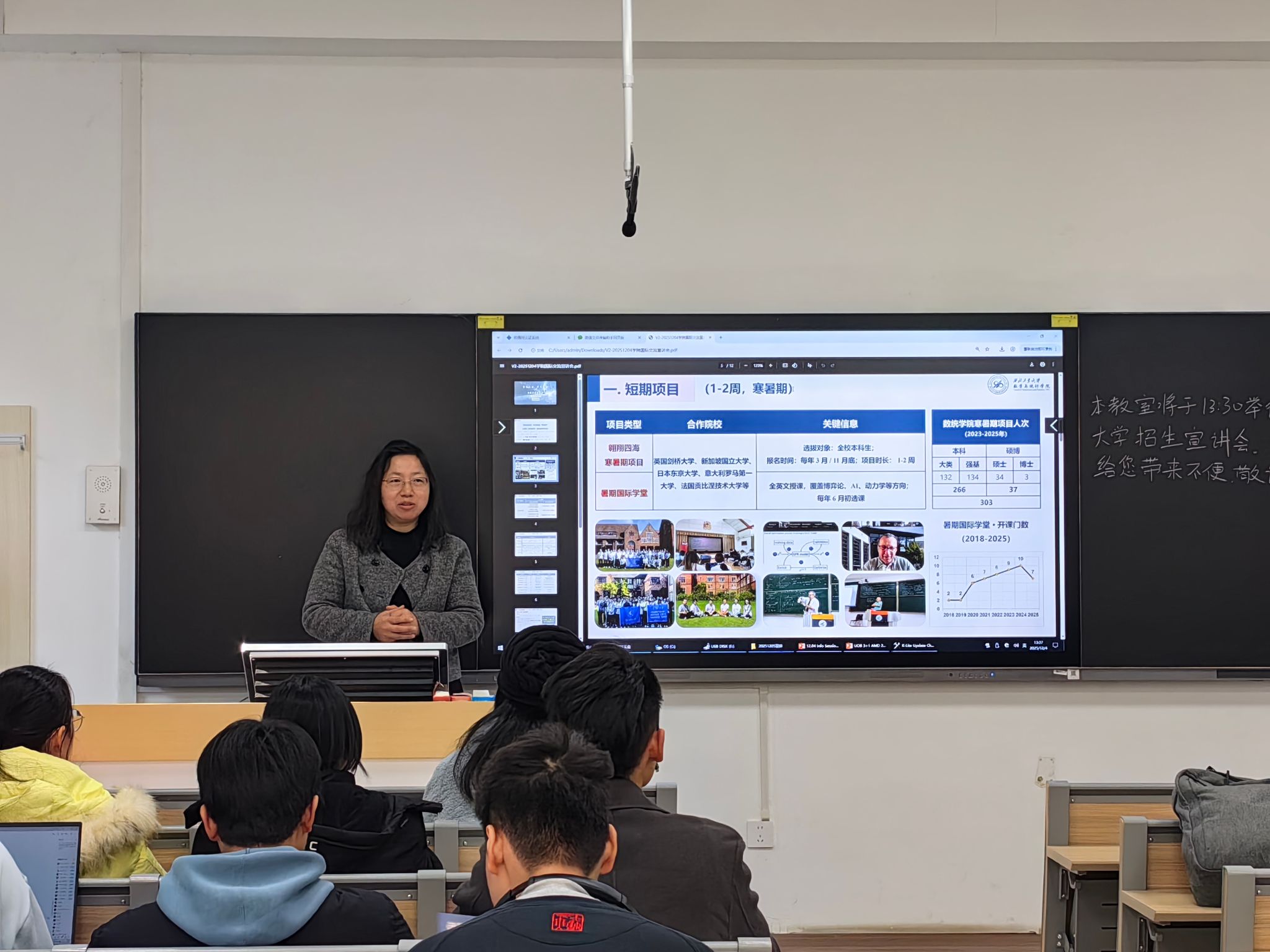 活动伊始,肖曼玉老师强调国际化视野对当代学子学术成长与职业发展的重要性。她从国家战略需求、学校国际化发展规划、学院特色交流体系三个层级,系统介绍了涵盖短期研学、中长期联合培养、海外毕设、公派留学等多类型出国境项目,并解读了国家、学校及学院配套的资助政策,为学生清晰梳理了国际化交流的路径与保障。