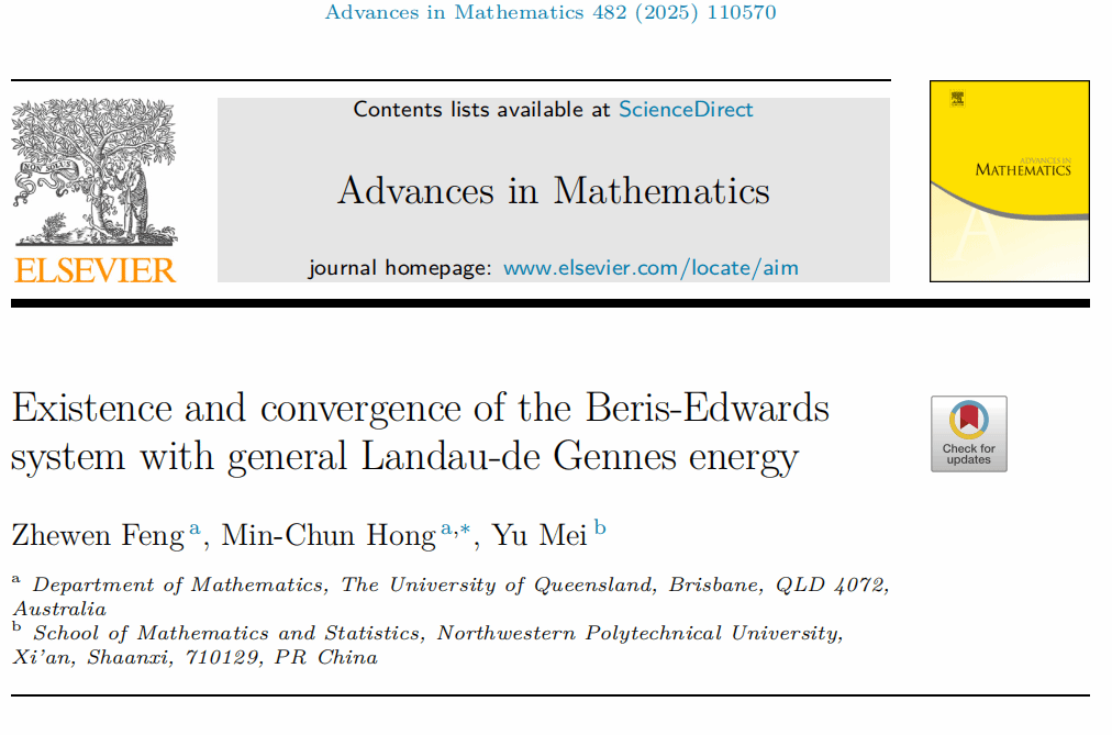 近日,yl6809永利官网集团梅钰副教授与澳大利亚昆士兰大学冯哲文博士、洪敏纯教授合作,在液晶流Beris-Edwards系统强解的存在性与收敛性方面取得重要进展。研究成果形成79页论文“Existence and convergence of the Beris-Edwards system with general Landau-de Gennes energy”在数学综合期刊《Advances in Mathematics》上在线发表。按国际惯例,论文作者依姓名字母顺序排列。