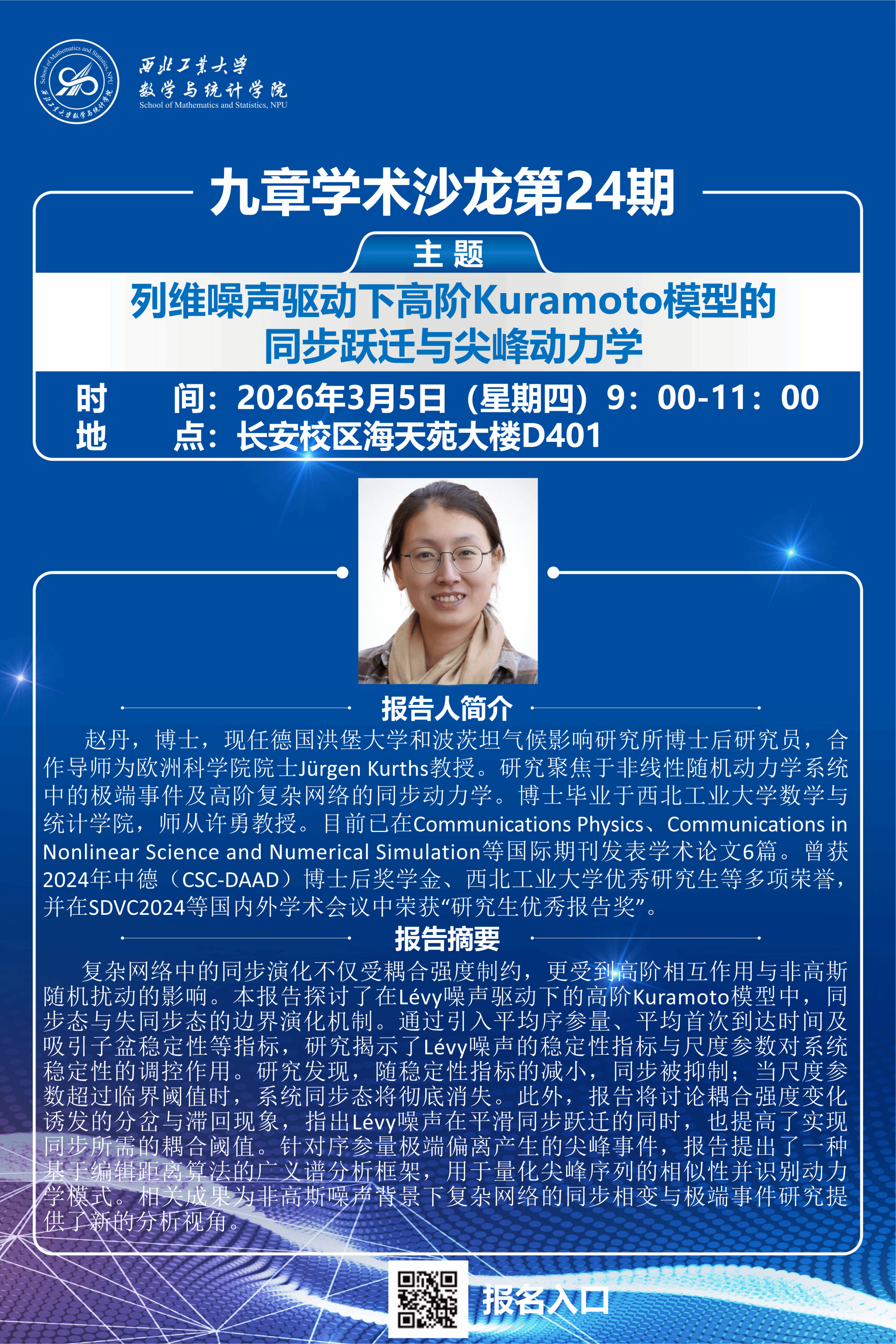 赵丹以《列维噪声驱动下高阶Kuramoto模型的同步跃迁与尖峰动力学》为题,探讨了在Lévy噪声驱动下的高阶Kuramoto模型中,同步态与失同步态的边界演化机制。报告通过对研究的高阶Kuramoto模型进行OA降维得到理论近似解,并分别观察在非噪声影响下、高斯白噪声影响下以及Lévy噪声影响下系统同步情况与概率密度分布。同时通过引入平均序参量、平均首次到达时间以及吸引子盆稳定性等指标,报告系统介绍了噪声参数等因素对系统稳定性的调控作用。对于序参量极端偏离导致的的尖峰动力学,她提出了一种基于编辑距离算法的广义谱分析框架,用于量化尖峰序列的相似程度并识别背后的动力学模式。其相关成果为非高斯噪声背景下复杂网络的同步相变与极端事件的研究提供了新的分析视角。