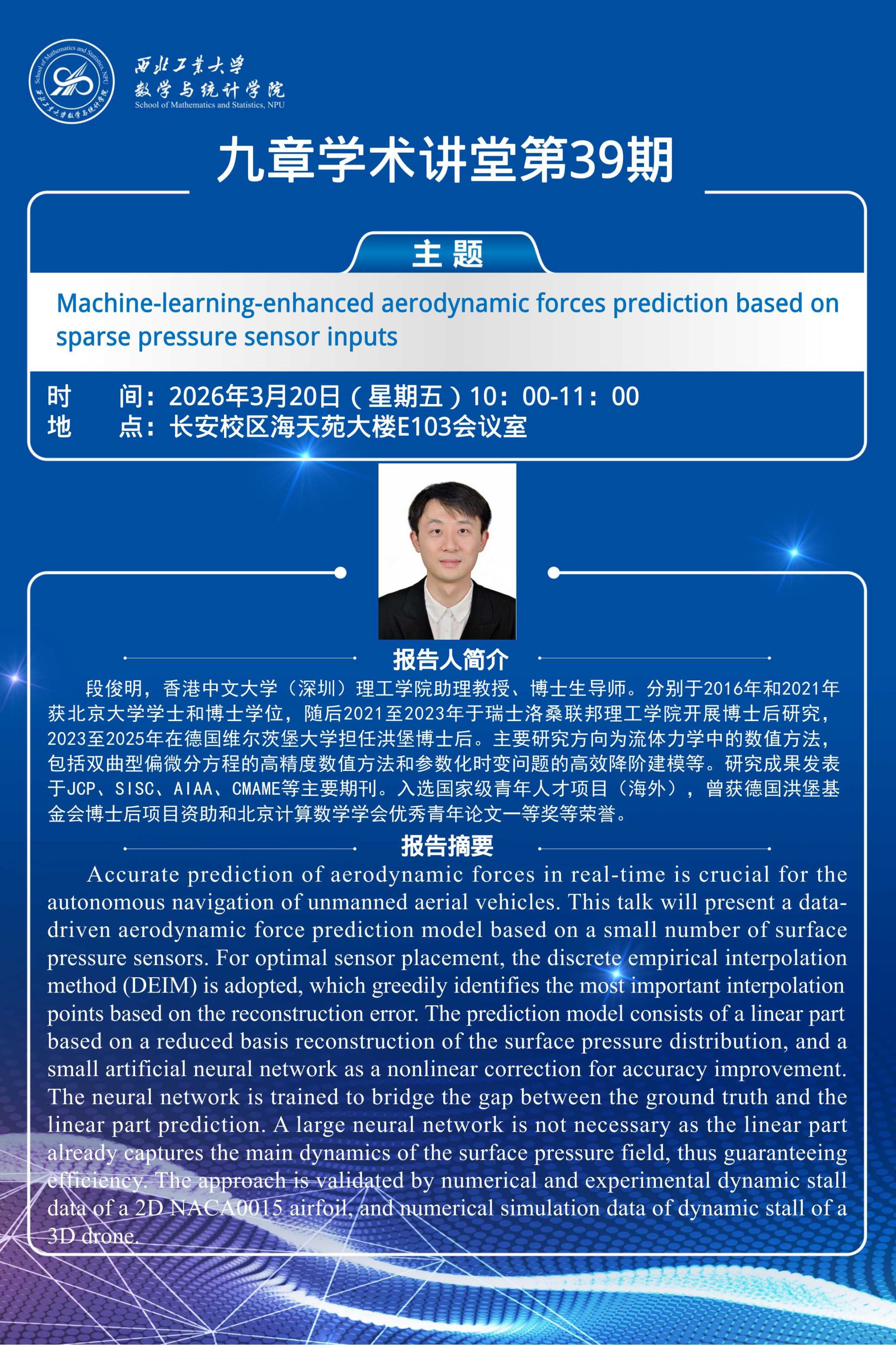 报告中,段俊明介绍了基于稀疏表面压力传感器的气动力预测数据驱动方法,通过离散经验插值方法(DEIM)实现最优传感器布局,精准识别重构误差下的关键插值点。预测模型包含基于表面压力分布降基重建的线性部分,以及用于精度提升的非线性校正人工神经网络。该神经网络可有效衔接真实值与线性预测结果,且无需大规模网络结构,凭借线性部分对表面压力场主动力学的捕捉,保障了计算效率。报告通过二维NACA0015翼型的动态失速数值与实验数据、3D无人机动态失速的数值模拟数据,对所提方法进行了全面验证。其研究成果为稀疏传感条件下气动力预测提供了新思路,也为相关领域的技术优化与应用拓展提供了重要参考。