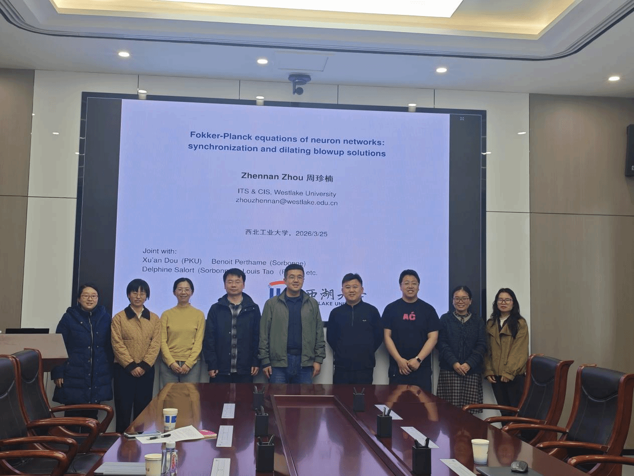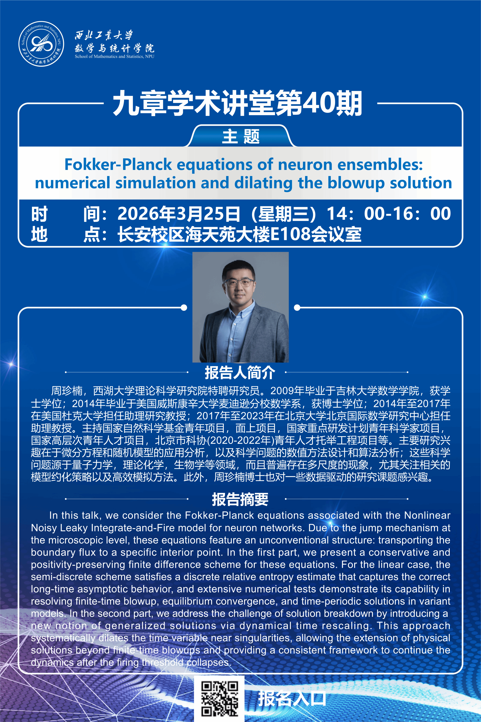 2026年3月25日,yl6809永利官网集团第40期“九章学术讲堂”在长安校区海天苑大楼E108会议室成功举办。本次讲堂邀请西湖大学理论科学研究院特聘研究员周珍楠博士作题为“Fokker-Planck equations of neuron ensembles: numerical simulation and dilating the blowup solution”的学术报告。报告会由赵丽静副教授主持,吸引了我院多位师生参加。