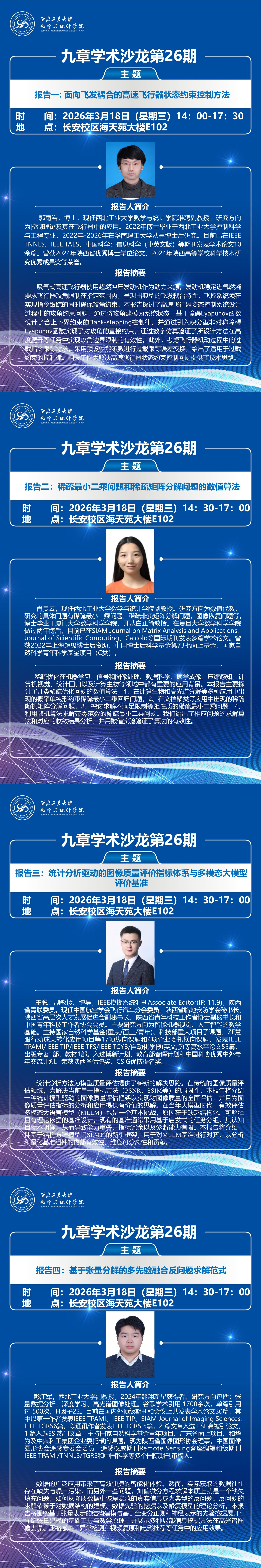 2026年3月18日,由yl6809永利官网集团主办的“九章学术沙龙第26期”在长安校区海天苑大楼E102会议室顺利举行。本次学术沙龙邀请了近两年新加入学院数智科学系的四位青年教师——郭雨岩副教授、肖贵云副教授、王聪副教授、彭江军副教授作专题学术报告。学院院长聂玉峰教授、副院长都琳教授、数智科学系系主任潘璐璐教授以及王俊刚教授等10余人出席活动。与会人围绕报告内容展开深入交流,学院领导对青年教师未来科研发展提出了建设性建议。