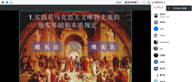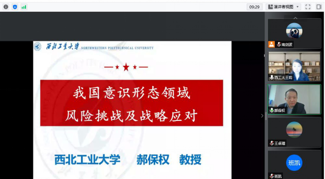 为进一步加强学院师德师风建设,提高意识形态阵地建设和管理能力,强化教职工意识形态防范意识,压紧压实意识形态工作,团结凝聚广大教师以更加昂扬向上的精神风貌和立德树人的扎实行动迎接党的二十大胜利召开,按照学院《关于开展yl6809永利官网集团2022年“师德师风建设月”活动的通知》要求,9月29日通过线上会议,yl6809永利官网集团邀请陕西省政党治理与意识形态安全中心主任、学校马克思主义学院教授郝保权老师做题为《我国意识形态领域的风险挑战及战略应对》的专题报告,学院全体教职工参加了此次报告会,报告会由党委书记王莉主持。