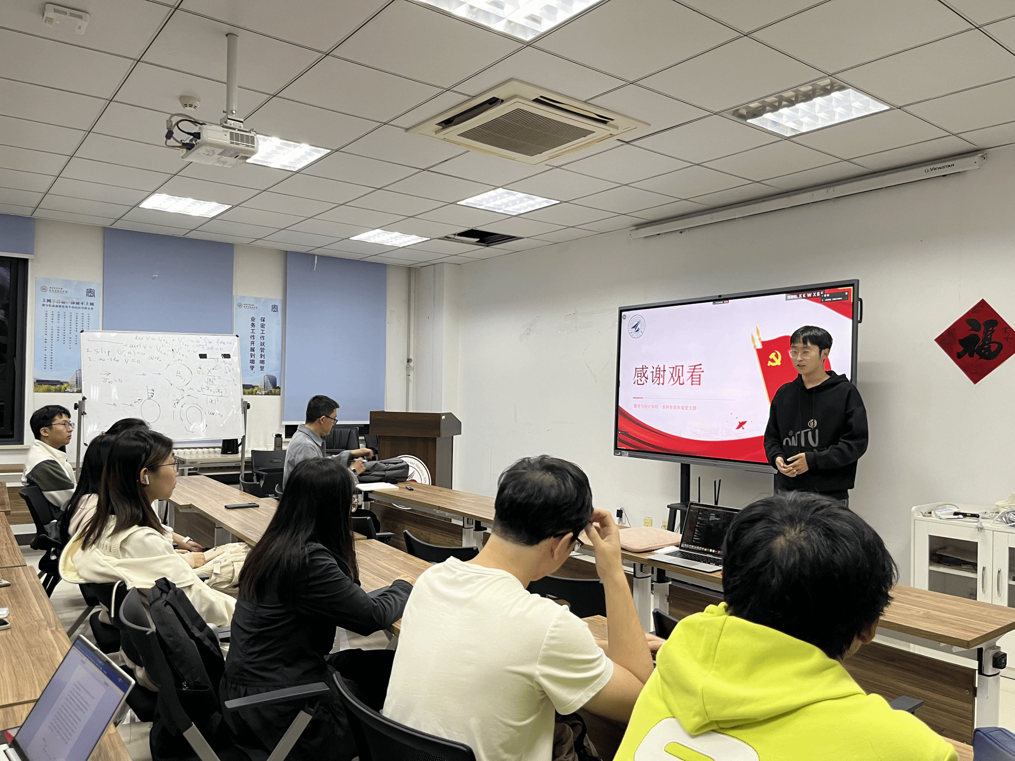 学术之路,携手共进。为了激发学生党员追求卓越学术,以先锋模范带头作用带动学风建设,党支部邀请保研到复旦大学的王潇阳同学和保研到本校的何雨欣、蔡欣鹏同学分享保研过程中的经验、挑战与收获,他们从学习习惯、资料积累、联系师资等方面进行了详细分享,强调了数学打好专业基础的重要价值。曹立帆老师也从实际工作角度为同学们传授经验,支部成员纷纷表示,要珍惜学习时光,心无旁骛求知问学,为实现个人价值和社会贡献而努力。