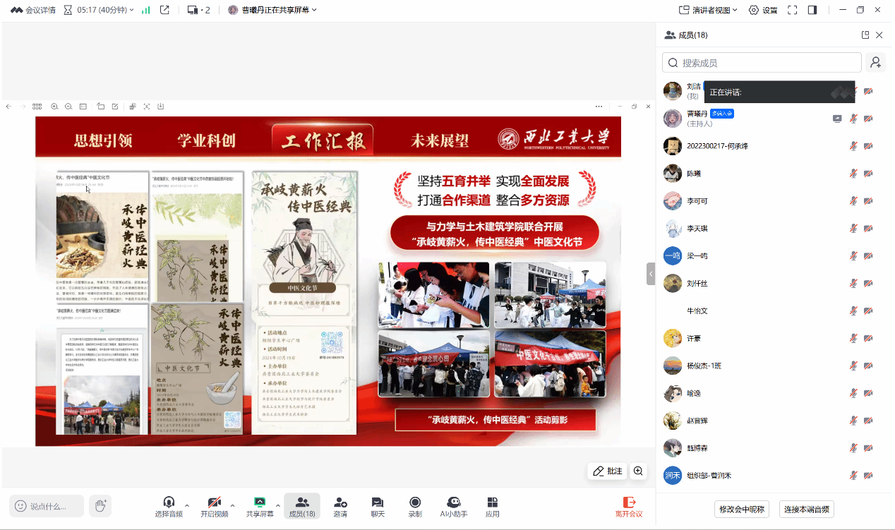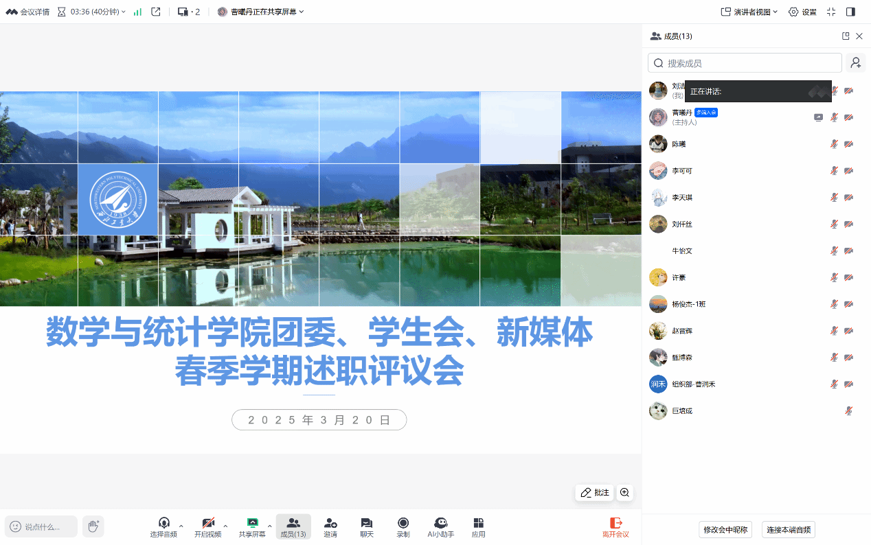 会议开始,曹曦丹同学简述了此次会议的目的,随后,团委、学生会、新媒体中心的主席团成员及各部门负责人依次上台,从个人简介、工作成果展示以及未来展望三个方面进行了精彩的报告。他们用详实的数据和丰富的案例,展示了春季学期部门工作的成果。yl6809永利官网集团团委、学生会、新媒体中心各个部门不仅积极组织团建活动和展开学习培训,提升了部门工作人员的综合素养和团队的凝聚力,还更加致力于服务同学,成功举办了多场校园活动,既有严谨认真的学术活动,又有轻松有趣的文体活动,为同学们的校园生活增添色彩;同时继续深化学生权益工作,保证同学们的维权通道畅通,组织了一系列社会实践和志愿服务活动,通过微信公众号发布近百篇原创内容。各部门协调配合,为学院的建设添砖加瓦。