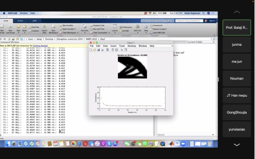 本课程共24学时,Balaji Raghavan教授详细阐述了每个算法和算例,由浅入深,对于学生提出的问题也耐心给予解答,让抽象的数学理论变得具象清晰,使得本次听课的学生对高级拓扑优化有了基本的认识。BalajiRaghavan教授授课期间,经常与学生问答互动,并采取PPT板书、线上运行程序等方式,激发了学生们的学习兴趣和热情。