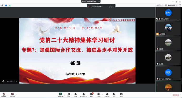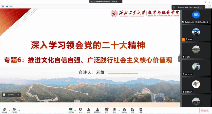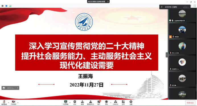 理论学习中心组成员围绕“提升社会服务能力、主动服务社会主义现代化建设需要”“推进文化自信自强、广泛践行社会主义核心价值观”“加强国际合作交流、推进高水平对外开放”“坚定不移全面从严治党、深入推进新时代党的建设新的伟大工程”“防范化解风险挑战,更好统筹发展和安全”五个内容,通过领导干部讲党课的形式,开展了集中学习研讨。此次学习研讨的五个专题以党的建设为基础,统筹推进社会服务能力提升、推进文化自信自强、加强国际合作交流、防范化解风险挑战,将学习二十大精神与学院各项工作紧密结合。