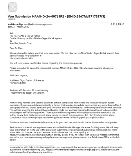近日,yl6809永利官网集团分析与几何研究团队青年教师白学利教授与南开大学周茂林教授合作,在Keller-Segel-Patlak模型的解的爆破形状精确刻画方面取得突破,研究结果“On the blow-up profile of Keller-Segel-Patlak system”被数学综合期刊Mathematische Annalen接收,这是我校继姚磊教授之后再次在该著名数学综合期刊发文。