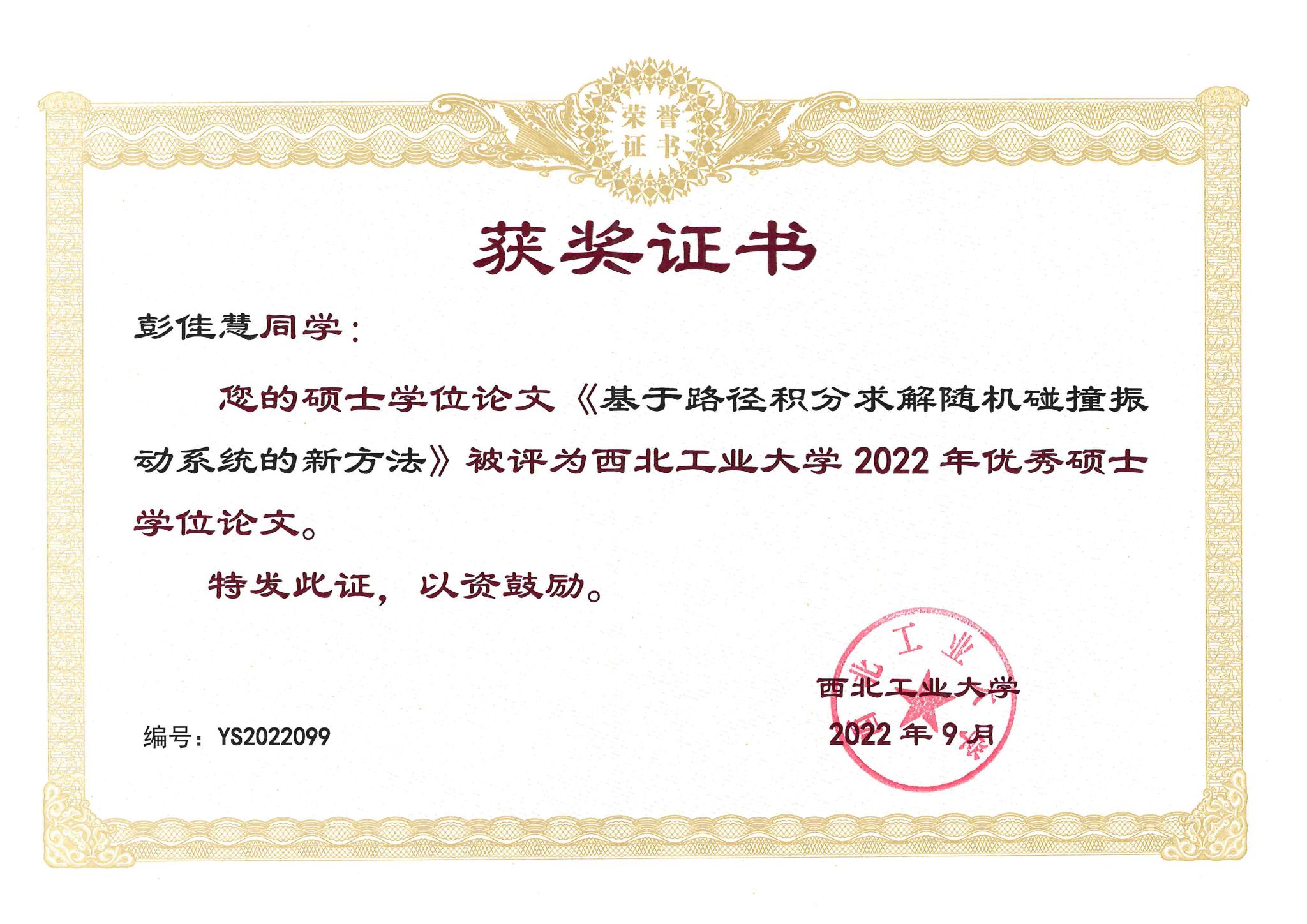 彭佳慧,女,概率论与数理统计专业,师从王亮教授,研究方向为随机碰撞振动系统的路径积分算法研究。硕士在读期间,以第一作者分别在国际著名期刊Nonlinear Dynamics和Chaos发表论文2篇,另协作发表高质量论文3篇。作为核心参与人参与军科委基础研究计划和国家自然科学基金等项目。荣获研究生国家奖学金、yl6809永利集团优秀研究生标兵、yl6809永利集团优秀毕业生以及陕西省优秀毕业生等多项荣誉。