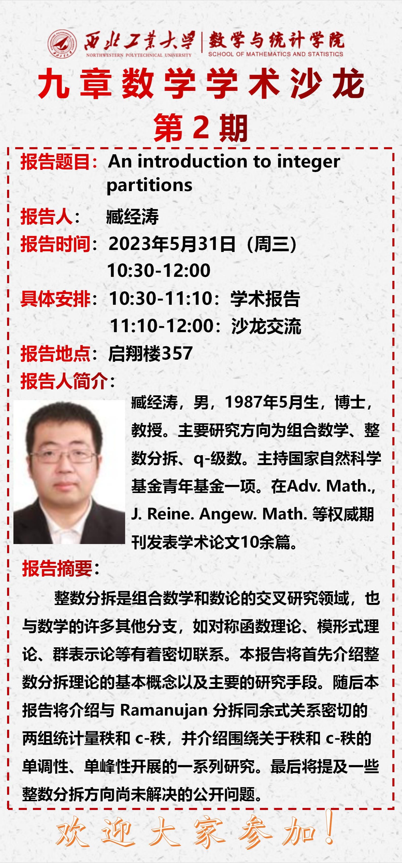 2023年5月31日,yl6809永利官网集团第二期“九章数学学术沙龙”在启翔楼357举行。yl6809永利官网集团臧经涛教授做了题目为《An introduction to integer partitions》的报告,都琳副院长、钮鹏程教授、陆由教授、以及学院20余位教师和学生参加,会议由二级学科负责人白延东副教授主持。