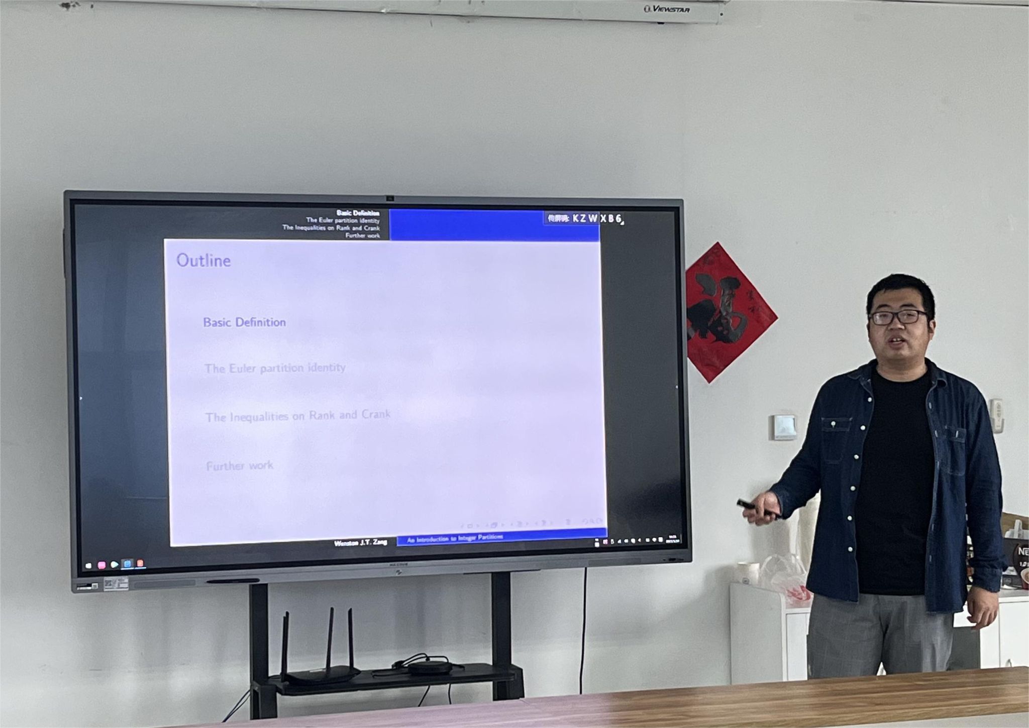 首先,都琳强调了举办学术沙龙在促进师生间学术交流与沟通方面的重要作用,表示学院后续会继续大力支持青年教师发展,为学术交流搭建更加广泛的渠道与途径。接下来,臧经涛分别从整数分拆的基本定义、欧拉分拆定理、关于秩和c-秩的不等式和后续研究方向四个部分详细介绍了本人的研究内容,并与参会师生进行了深入热烈的讨论。