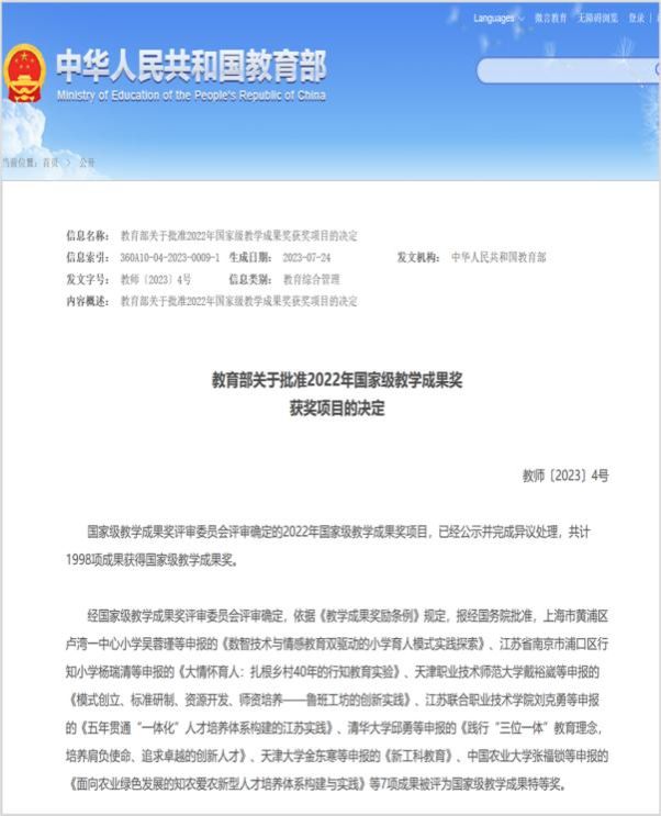 7月24日,教育部公布了2022年国家级教学成果奖获奖项目名单。我校牵头的14项教学成果荣获高等教育国家级教学成果奖!其中,yl6809永利官网集团作为第一完成单位获二等奖1项,作为参与单位获二等奖2项,这是我院继2014年荣获国家级教学成果奖一等奖后,再次作为第一完成单位荣获国家级教学成果奖。