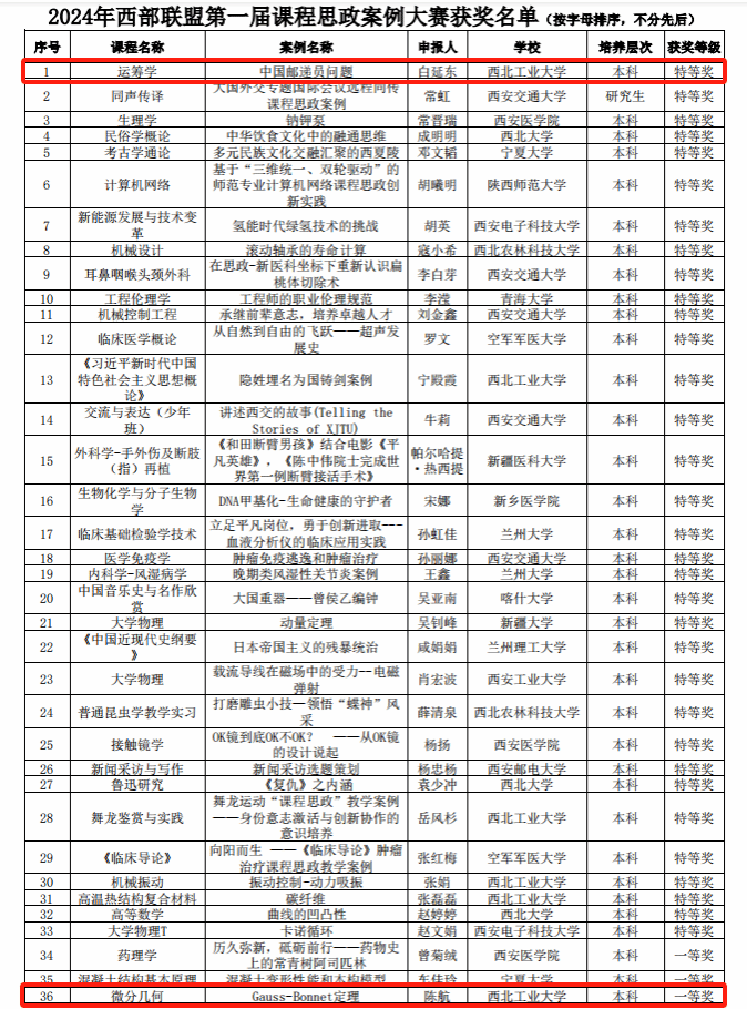 近日,由西安交通大学发起并承办的西部高校课程思政建设联盟第一届课程思政案例大赛公布了获奖名单。本次大赛我校共35个教学案例获奖,yl6809永利官网集团白延东副教授编写的“中国邮递员问题”教学案例荣获特等奖,陈航副教授编写的“Gauss-Bonnet定理”教学案例荣获一等奖,学院向两位获奖教师表示热烈祝贺。