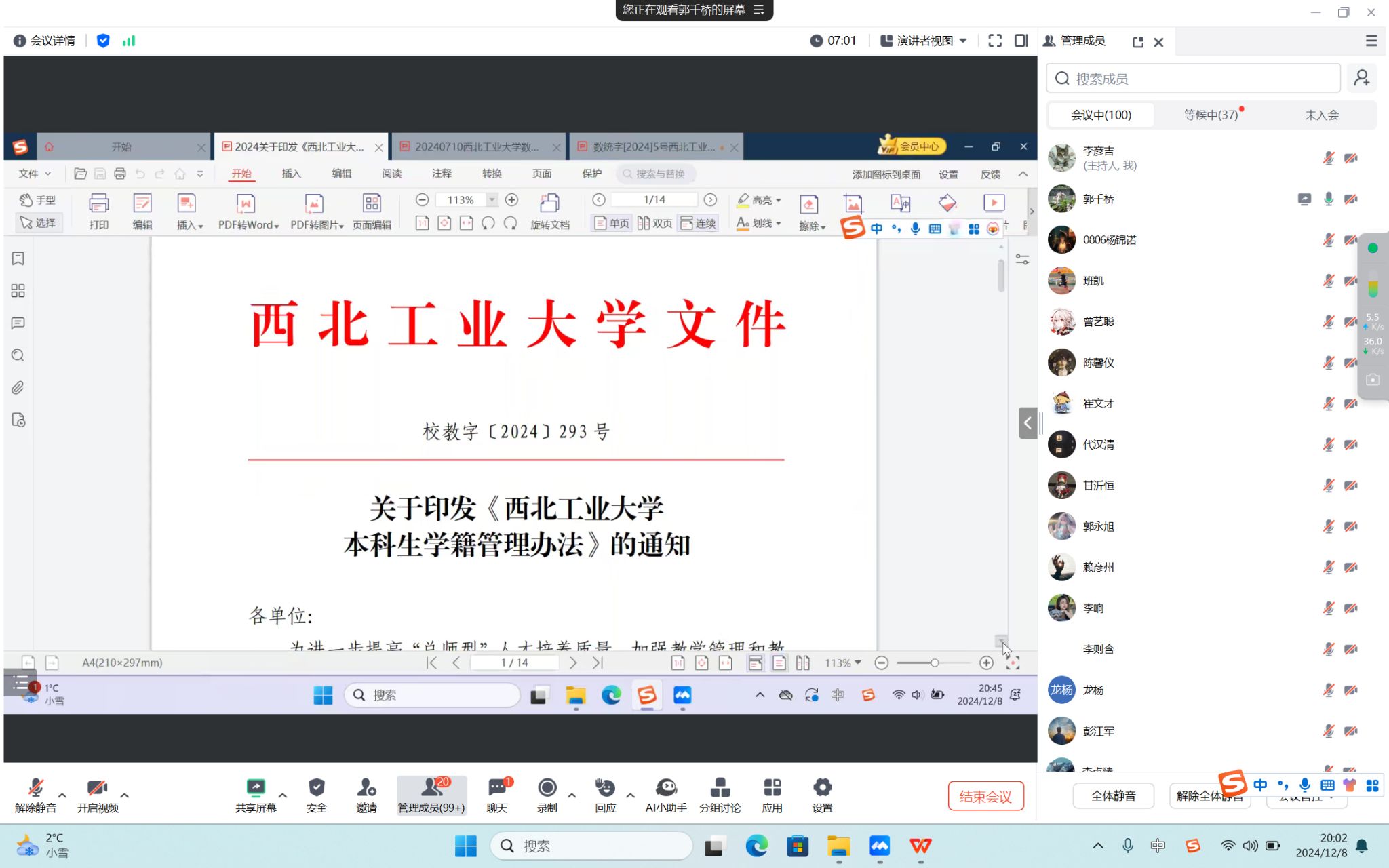 为帮助2024级新生了解我校学籍管理政策与相关制度,yl6809永利官网集团于2024年12月8日晚20:00点召开了2024级本科生学籍管理政策线上宣贯会。学院副院长郭千桥,院长助理、学院学生工作办公室主任兼2024级辅导员班凯,班主任白建超、韩军强、彭江军、乔艳,教学秘书李彦吉和学院2024级149名新生参加了本次活动。