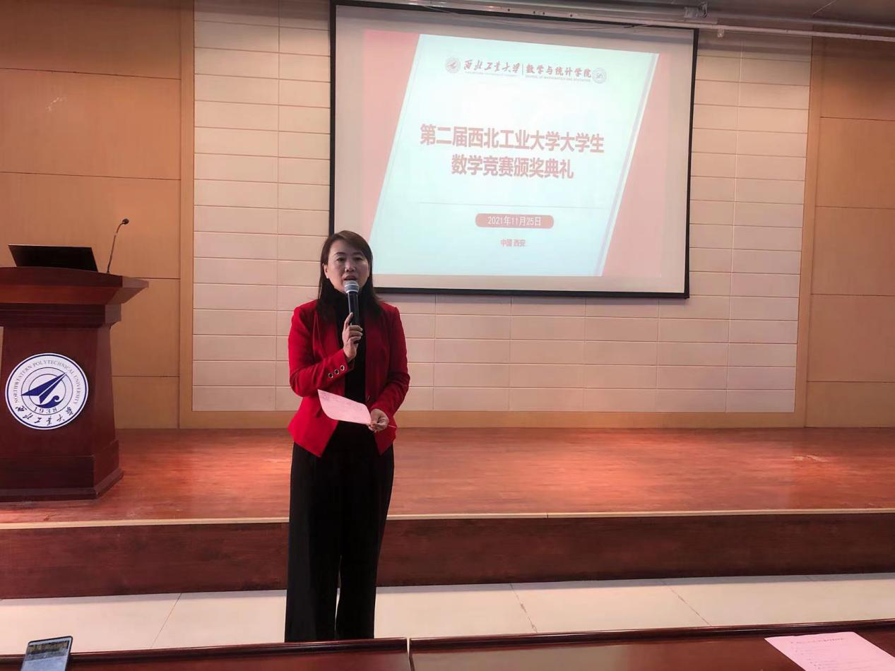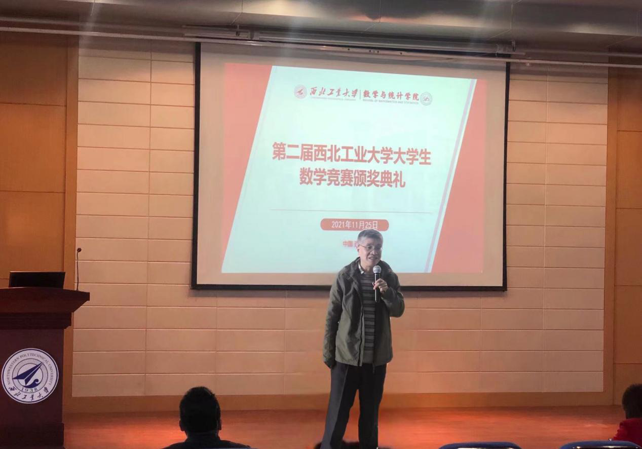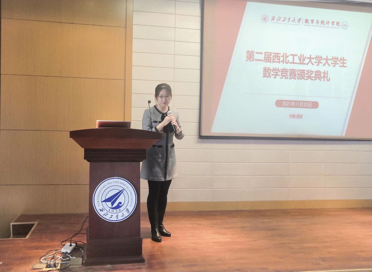 都琳介绍了举办西工大数学竞赛的意义及本次竞赛的总体情况。本次数学竞赛全校共有887名学生报名参赛,竞赛分为非数学专业组和数学专业组,其中,非数学专业组765人,数学专业组122人。我院数学专业组获奖学生共104人,其中,特等奖10人,一等奖24人,二等奖35人,三等奖35人。都琳表示同学们要积极参加各类竞赛,通过参加竞赛来检验自我学习的情况,从而拓宽学术视野。与此同时,通过分析参赛学生的试卷,能够发现教育教学中的不足,进而推动教育教学改革,使数学学科得到更好的发展。