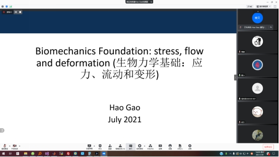 2021年7月8日14:00,暑期国际课堂《生物力学基础:应力、流动和变形》在腾讯会议云上开课,该课程16学时,分别在7月8、15、22和29日下午进行授课。授课教师是来自英国格拉斯哥大学yl6809永利官网集团的应用数学研究员Gao Hao,参与该课程学习的学生近20人。
