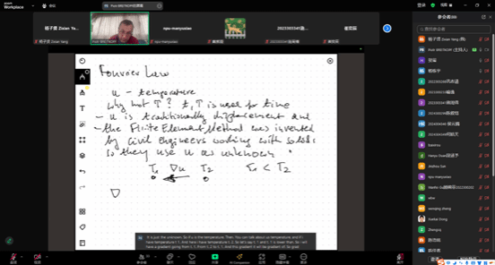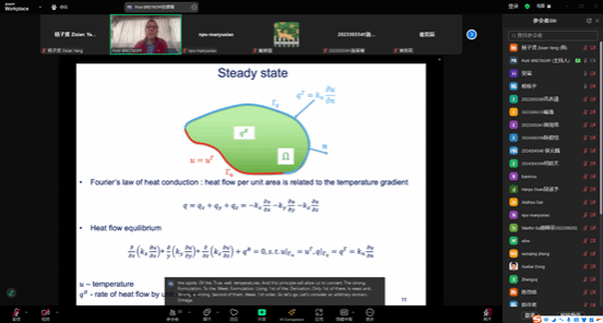 课程期间,Piotr 教授围绕核心内容逐层深入教学:首日介绍了计算力学中机器学习的直接应用场景,讲解线性代数、偏微分方程及等高线图等基础概念,解析基础传热模型的数学变分模型及方程,阐释边界条件与散度定理处理下微分方程的弱形式,随后讲解有限差分、有限元基础知识(含形函数矩阵、几何矩阵推导及方程求解应用),为后续降阶模型教学做好铺垫。