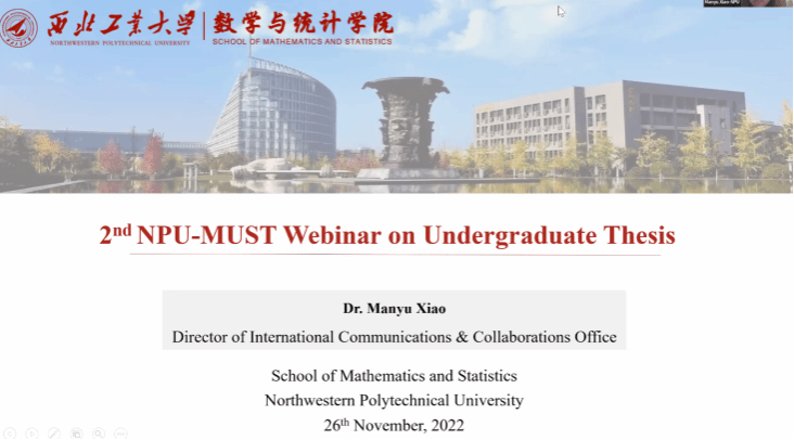 为进一步推进我院国际化工作水平,提升留学生培养质量,2022年11月26日上午10:00,yl6809永利官网集团与蒙古科技大学在ZOOM线上平台举行本科毕业论文工作推进会。会议由国际交流与合作办公室主任肖曼玉主持。出席本次会议的有yl6809永利官网集团副院长都琳、副院长郭千桥、应用概率统计系主任王亮、毕设导师王晓东、马荣、邢超(航天学院),国际交流与合作办公室秘书李卓榕,蒙古科技大学数学系主任Battsetseg Gereltbyamba、副导师ARIUNGEREL Jargal、MUNKHGEREL Tsegmid、TAIGYNTUYA Bayaraa以及3名蒙古学生。